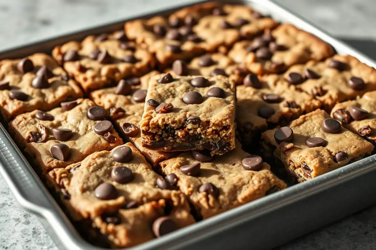 No bake Christmas cookie squares with chocolate chips and nuts on gray background