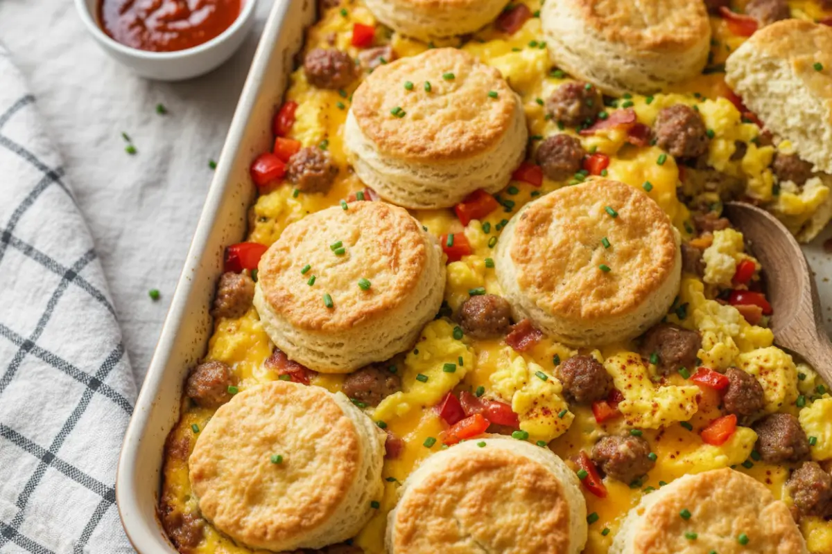 Holiday Morning Breakfast Casserole with Biscuits and Eggs