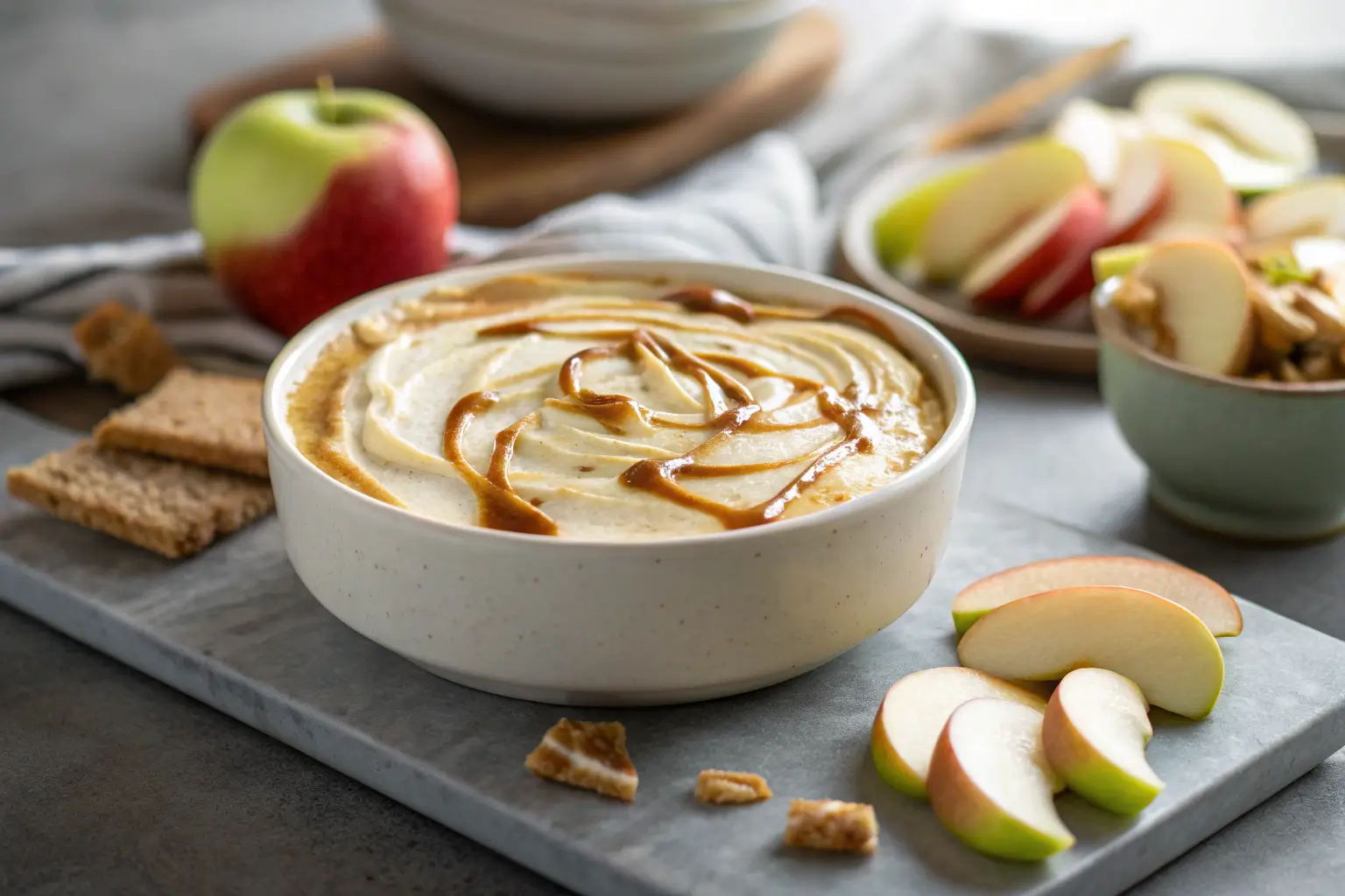 - Finally, serve the dip with the apple slices arranged around it. The contrast of colors is inviting, and the fresh apples will make your guests excited to dig in.